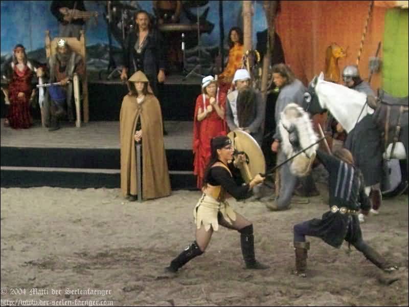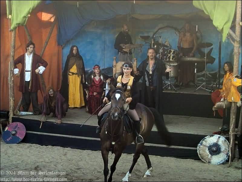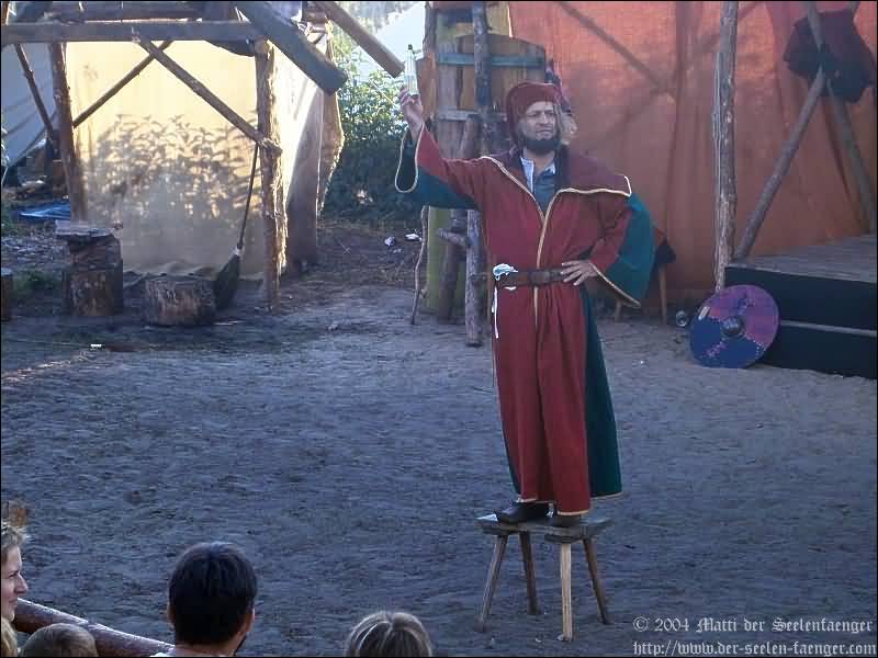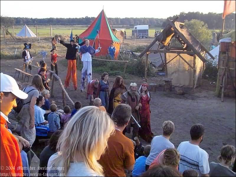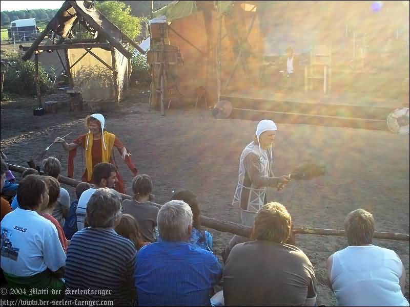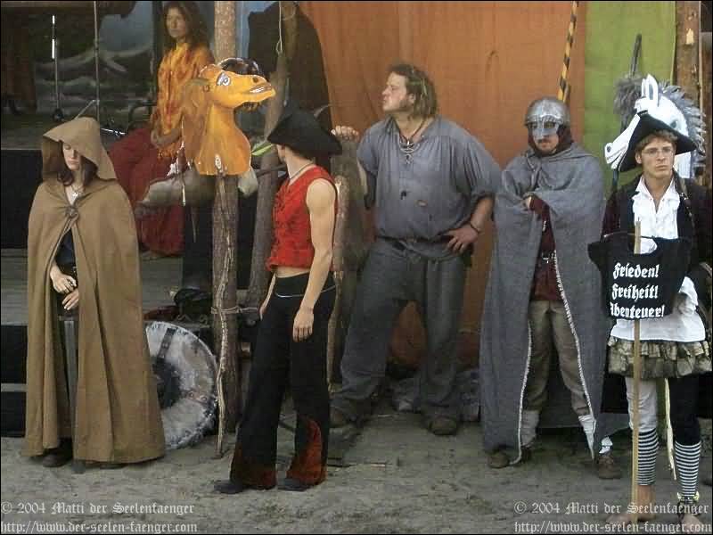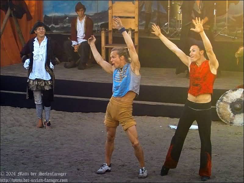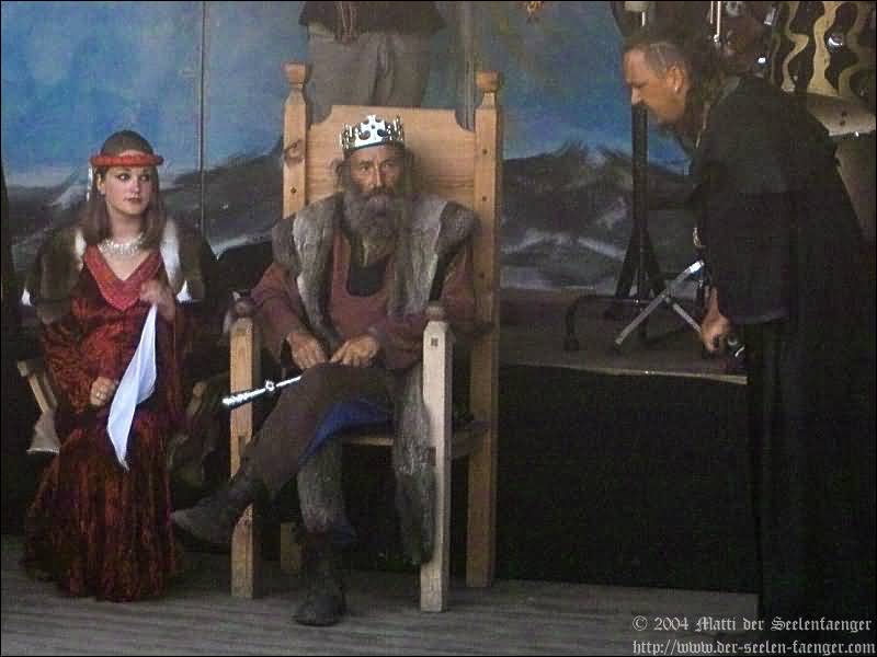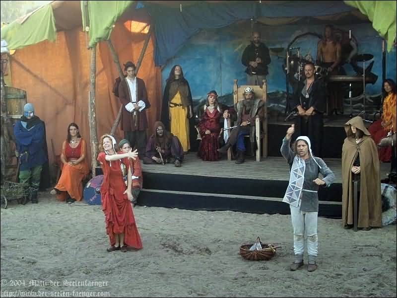 von Dänemark und Hein von Dierhagen Zur Geschichte: Der König wurde angekündigt und das Volk von Dierhagen bereitet ein Fest zu seinem Empfang vor. Quacksalber (Zeter und Mordio) mit einer Wundertinktur, die Blinde Sehend macht, und Gaukler (Die Flugträumer) bevölkern den Markt. Da platzt Margarethe von Dänemark in die Festvorbereitungen und fordert Tribut von den Einwohnern Dierhagens, doch den können sie nicht zahlen. Margarethe stellt ein Ultimatum von drei Tagen, dann wird sie ihre Forderungen eintreiben: Das Vieh wegführen, die Männer schänden und die Häuser anzünden. Hilfe kann nur noch Hein von Dierhagen bringen, ein wackerer Jüngling, der zum Lohn die schönste Jungfrau des Ortes bekommen soll. Dann kommt der König mit seinem Gefolge und die Einwohner Dierhagens klagen ihm ihr Leid. Margarethe tritt auf und der König verlangt ein Gottesurteil über die Rechtmäßigkeit ihrer Forderungen. Es kommt zum Zweikampf zwischen Margarethe von Dänemark und Hein von Dierhagen - und Hein gewinnt! Das Volk ist erlöst! Der König spendiert dem ganzen Volk Bier - wenn sie es denn bezahlen.